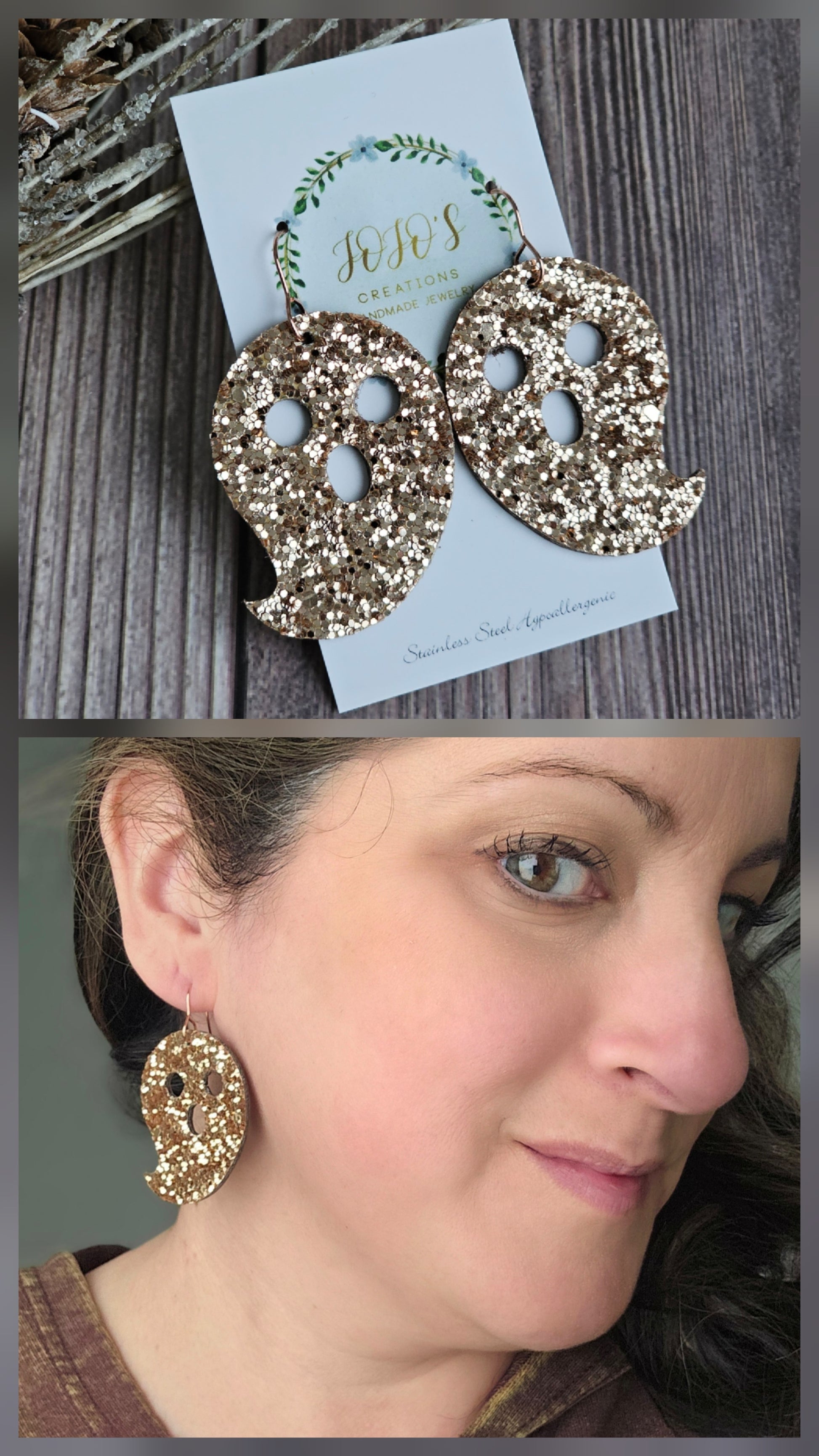 ~Measures 2 inches from top of ear wire to bottom. Glitter backed with Genuine Leather.